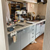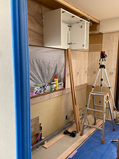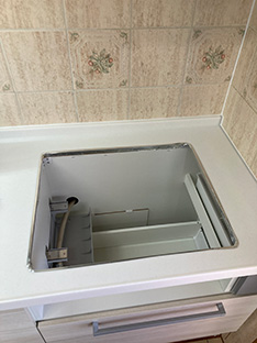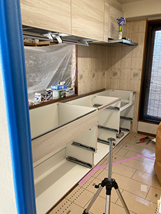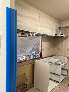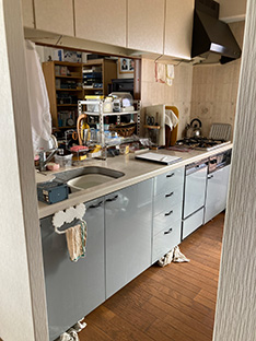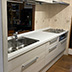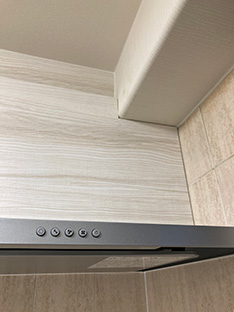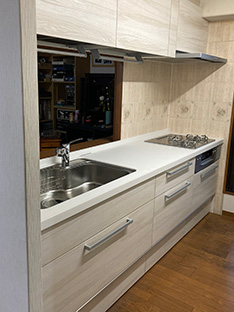 現在の調理台は80センチとお客様には低く、腰が痛くなるのが悩みだったとのこと。 高くするのは決めていたが高さに悩まれていたので、実際にショールームで体感し、動線も考えて85センチを選ばれました。 ウッド調のホワイトパネルもショールームで決定。やはり実物をみれたのがよかったと喜んでいただきました。