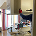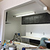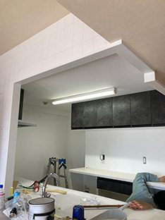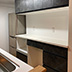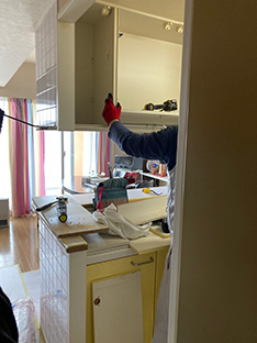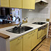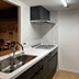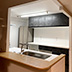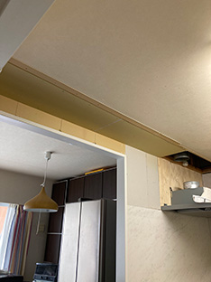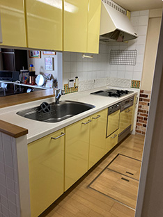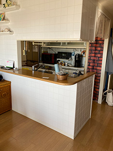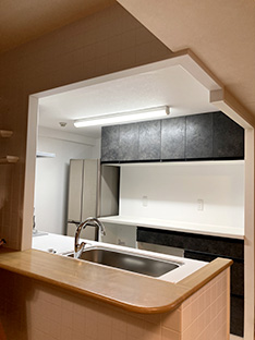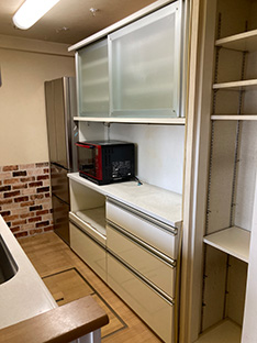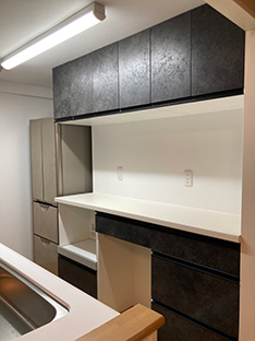 仕切り壁上部を撤去するにあたり、裏側の吊戸棚を撤去しました。 あまり使っていないとのことでしたので思い切った判断でしたが、圧迫感のない開放的なキッチンになったと喜んでいただけました。 背面の収納部分も作り付け棚を解体し大きなカップボードを入れることで広く使いやすく。 調理部分と同色でまとめてスタイリッシュな雰囲気になりました。